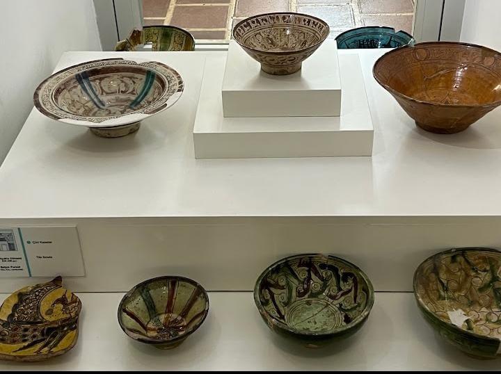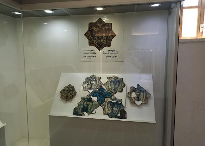 Medrese duvarlarındaki mozaik çinilerin büyük bir kısmı dökülmüştü. Çinilerde kullanılan renkler, firuze, lacivert ve siyahtır. Anadolu Selçuklu Devri çini işçiliğinde önemli yeri bulunan Karatay Medresesi 1955 yılında "Çini Eserler Müzesi" olarak ziyarete açılmış, sergilenen eserler Anadolu, Selçuklu ve Osmanlı Dönemine aittir. Celaleddin Karatay Türbesi'nin bulunduğu hücrede ve güneydeki öğrenciye bakılırde Kubad-Abad Sarayı'nda (Konya Beyşehir'de Anadolu Selçuklu Devleti'nden yola ulaşmış tek saray yapısı) bulunan çinileri alçı süsleri, çini tabaklar, kandiller ve sırsız seramikler sergilenmektedir. Eyvanda Selçuklu Dönemine ait çini kalıntıları, Selçuklu ve Osmanlı Dönemine ait seramikler, Kubbeli salonda da Selçuklu Dönemine ait cam tabak, çini parçaları, Beyşehir Eşrefoğlu Camii'ne ait tavan göbekleri ve Osmanlı Dönemine ait seramikler bulunmaktadır.