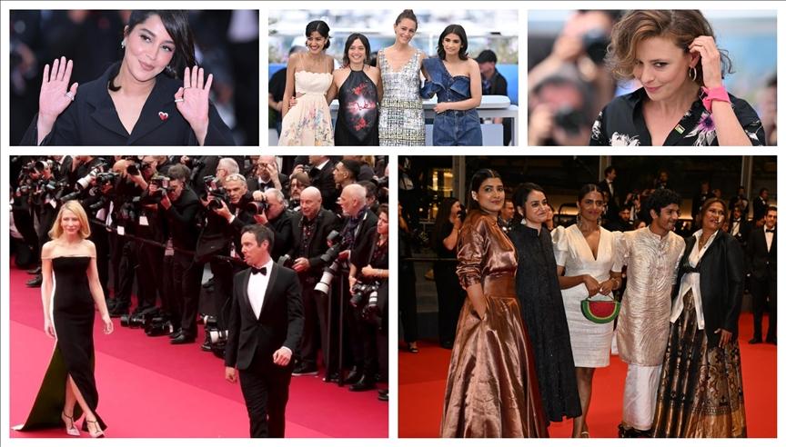 Hint oyuncu Kani Kusruti, karpuz dilimi şeklindeki çantasıyla katılırken, Cezayir asıllı Fransız oyuncu Leila Bekhti, Filistin ile dayanışmanın sembolü olan karpuz motifli bir broş taktı.