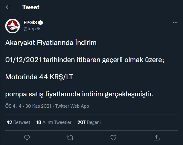 EPGİS'ten yapılan açıklamada, "01/12/2021 tarihinden itibaren geçerli olmak üzere, motorinde 44 KRŞ/LT pompa satış fiyatlarında indirim gerçekleşmiştir," denildi.
