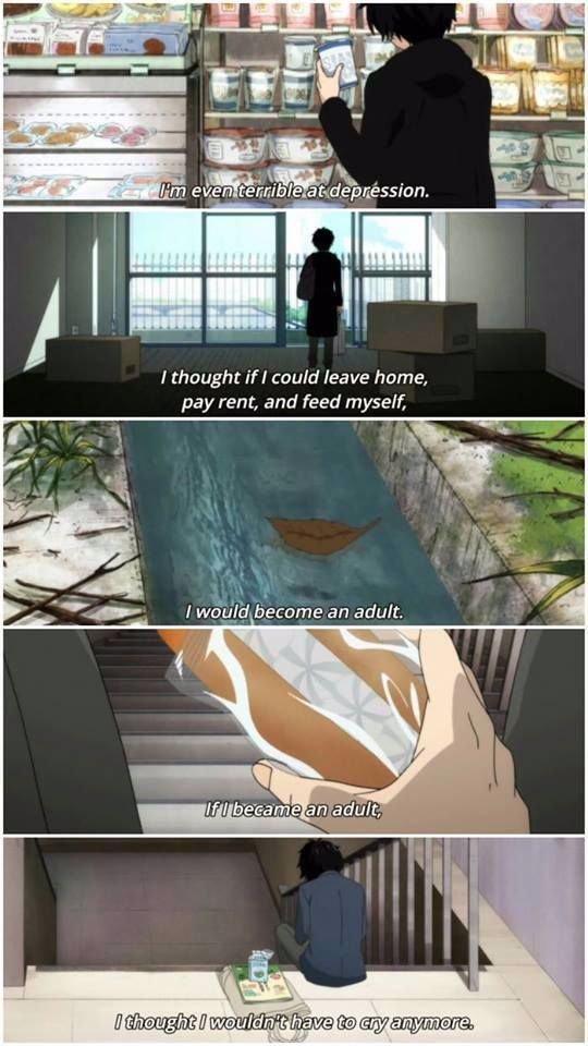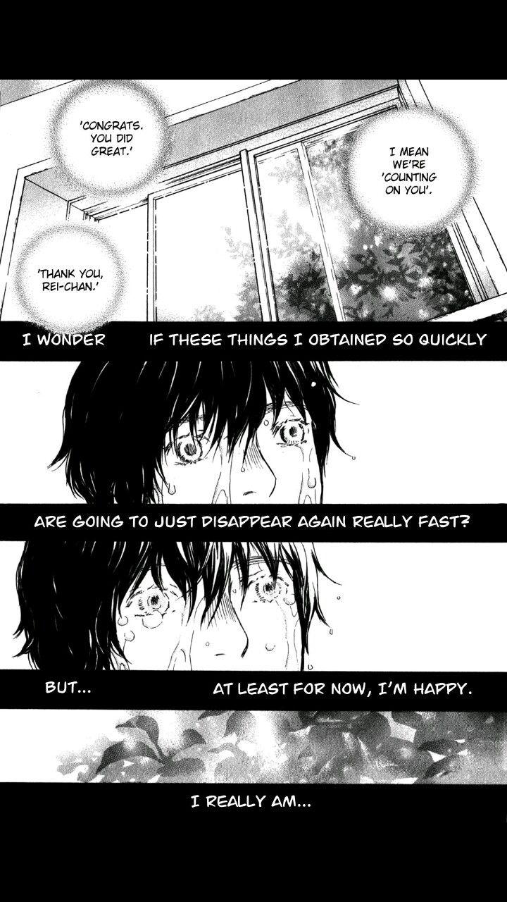 Watching Rei figuring out that life is just a never-ending battle, and struggle to find any reason to keep fighting feels so familiar. His depression is not romanticized like some other shows do, and his healing path is non-linear. He lives drawbacks and ends up coming where he started sometimes. But slowly, at some point, he learns to value and appreciate himself. He manages to accept other's love and learn to give love to others by abandoning his self-pity cycle and leaving his comfort zone. He comes to terms with the complexity of human relationships. He knows that loving means showing vulnerability, and the risk of hurting. And yes, you will be damaged because of others, but that's the only way you will ever feel the wonders of human connection.