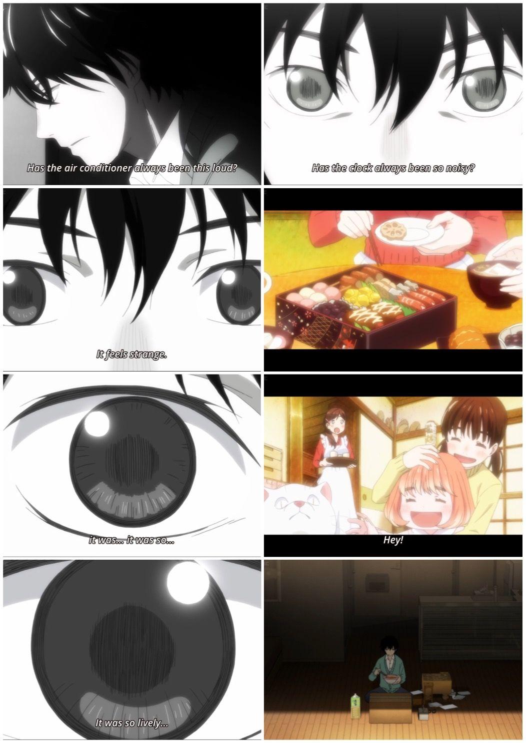 So he always feels out of place, sitting and eating with them in a family-like environment, yet hearing the bells of danger ringing in his head constantly. It's ringing and warning him; the warmness of others is a sweet trap, one that strips away your most precious part after they eventually leave you, remember that they will always leave. We should stay in our comfort zone, with ever-familiar coldness and pain, it says. And so, Rei cannot allow himself to love them, or to be loved by them completely. Living with this self-protective and tired self, he still keeps going for no reason ahead. He resembles living to constantly swimming to an island that you will never reach. We humans think that we will reach a final destination and settle once we achieve something. As for Rei, he thinks that he swam so much to arrive at that island by becoming a professional shogi player and started living alone, so he could settle down and rest, but no. Now he has to keep swimming and needs to reach another island, he needs to elevate his ranking, earn more money, learn to open himself up, and deal with more and more ordeals... He realizes that he will never be able to reach that one island and always has to keep swimming similar to life. And he just cannot accept that. Why should he even keep swimming, for what reason, what does he even have to hold onto?