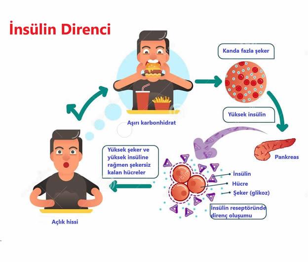 Son yıllarda insanların yeme alışkanlıkları birçok yönden vücudumuzdaki insülin seviyesini sürekli yüksek seviyelerde tutacak yönde evrildi. Geç saatlere kadar ayakta kalıyor, normalde uyuduğumuz saatlerde bile yemek yiyor ve yiyeceklere ulaşımın kolaylaşmasından dolayı bir şeylerle uğraşırken sürekli bir şeyler atıştırıp yemek yeme aralıklarımızı kısaltıyoruz. Ve her yemek yediğimizde, özellikle karbonhidrat, vücudumuz onu glikoza çevirir ve kana karışır. Yükselen glikoz seviyesine yanıt olarak pankreas insülin salgılar ve kandaki glikozu depolamak için ya da enerji olarak kullanılması için vücudunuzun başka yerlerindeki hücrelere taşır. Yani her yediğimizde vücudumuz insülin salgılayıp kandaki glikoz seviyesini düşürür. Fakat, çok şekerli, karbonhidrat ağırlıklı ve sık yediğinizde insülinin düşmesine fırsat veremezsiniz. Bu tip bir beslenme tarzı insülin direnci geliştirmenize neden olabilir.