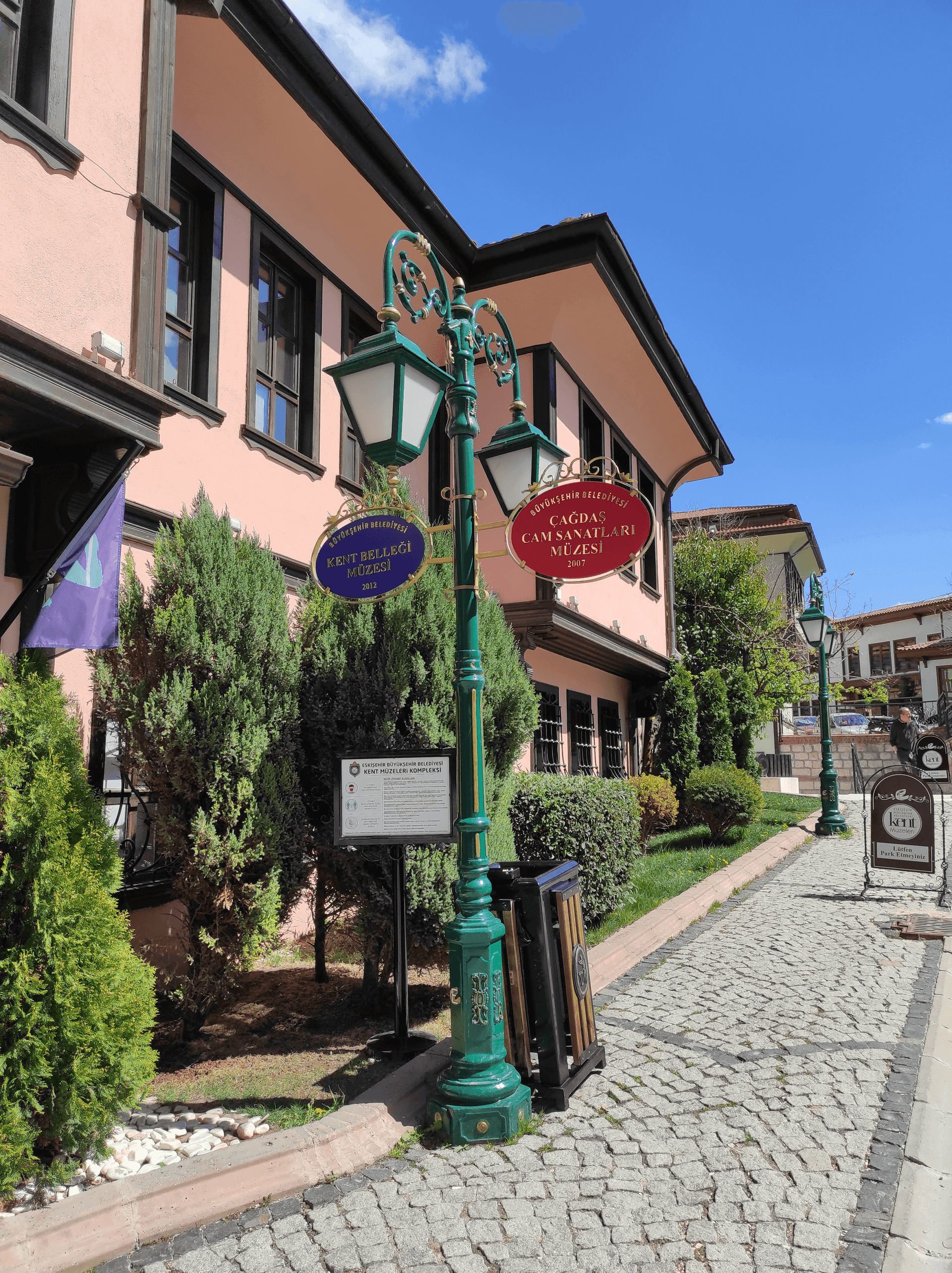 Eskişehir Çağdaş Cam Sanatları Müzesi, Türkiye’de açılan ilk cam sanatları müzesidir. 42 cam sanatçısının eserleri bu müzede sergileniyor. Yerli sanatçıların dışında Japon, Alman, Letonyalı, Polonyalı bazı sanatçıların da hediye ettiği cam eserler müzede yer alıyor. Müzenin önüne geldiğimizde ilk olarak sağ tarafta kırmızı ve mavi tabelalarla yazılı olan müze isimleriyle karşılıyoruz.