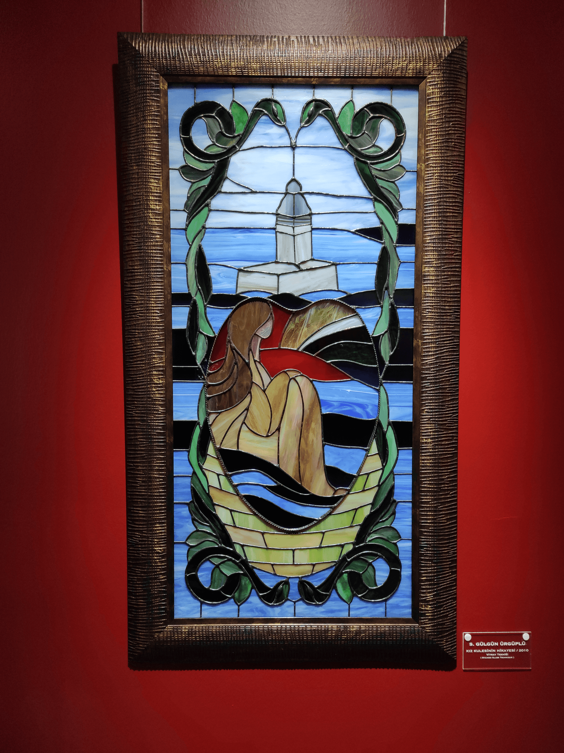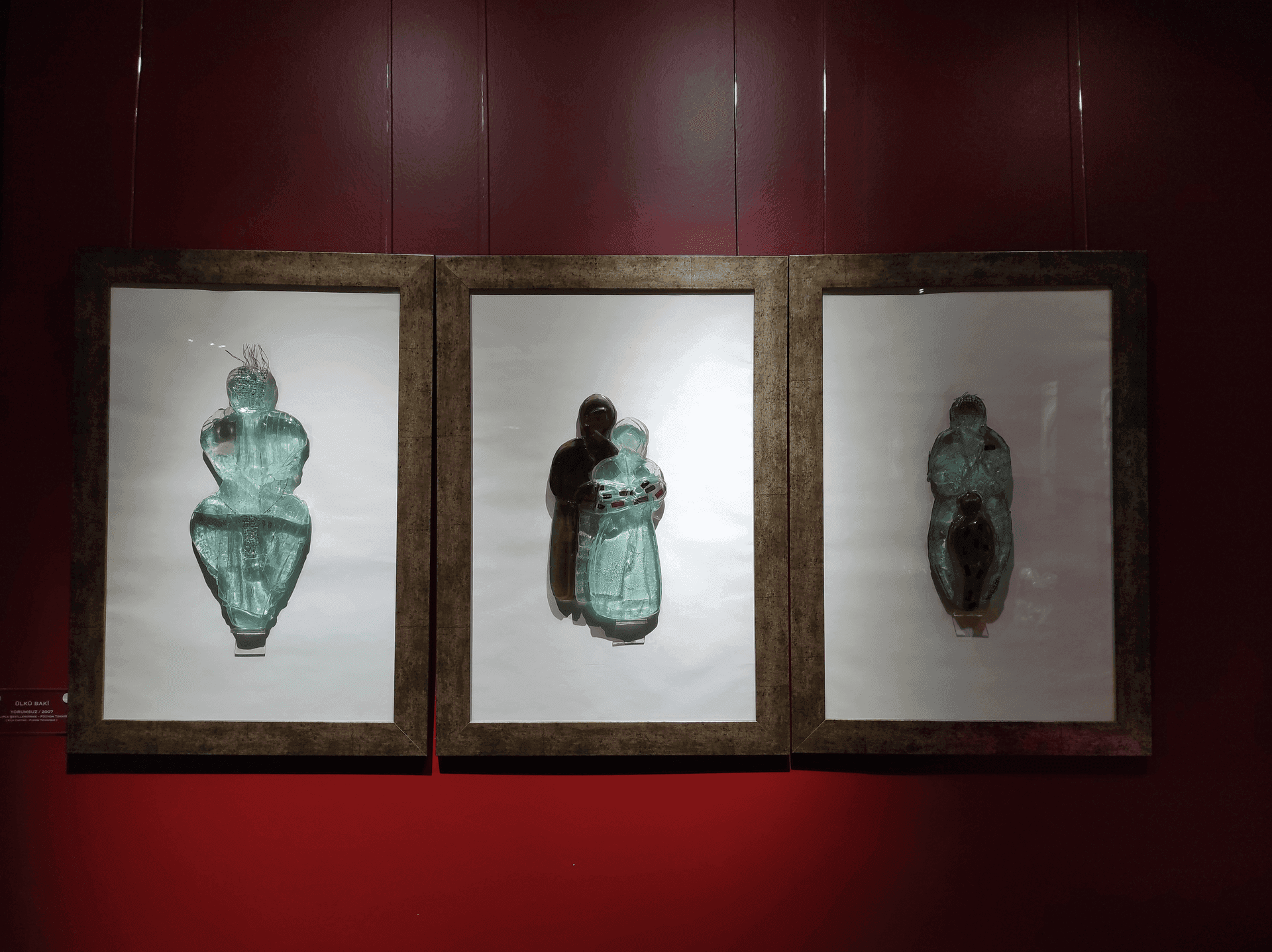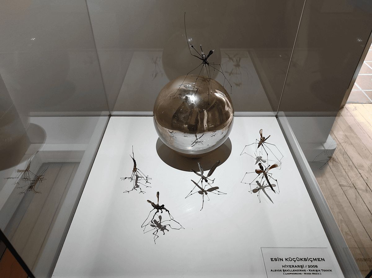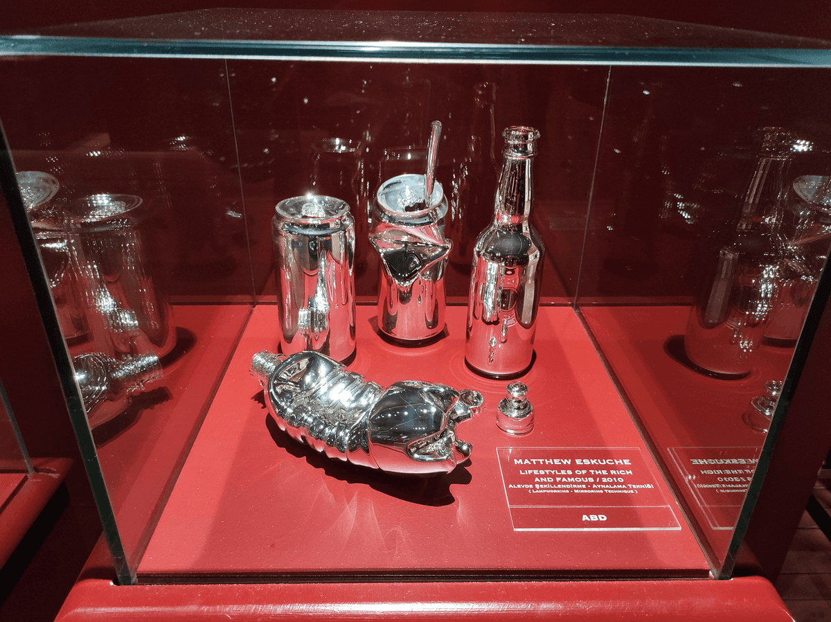 Süs havuzunun üzerinde ise camdan yapılan çok renkli avize tarzı bir eser bizi karşılıyor. Daha sonra sol tarafta bilet satın almamız gereken bir gişe bulunuyor. Gişeden biletimizi satın aldıktan sonra sağ taraftaki odaya yönlendiriliyorsunuz. İlk baktığımızda kıpkırmızı duvarları olan, zemini tahtadan yapılmış ve nispeten loş bir oda olduğunu görüyoruz. Duvarın dört tarafına altı yine kırmızı büstlerden oluşan cam fanuslarla eserler yerleştirilmiş ve odanın tam ortasında da sadece bir tane eser bulunmakta. Odanın duvarları ve büstlerin kırmızı renkte olması benim çok hoşuma gitti. Hem çok dikkat çekiyor hem de bence eserlerin kendi renklerine ve saflığına daha çok dikkat etmenize neden oluyor. Odanın içi loş olduğu için atmosfer harika. Şimdi sizlerle bu odanın içinde bulunan bazı eserlere bakalım.