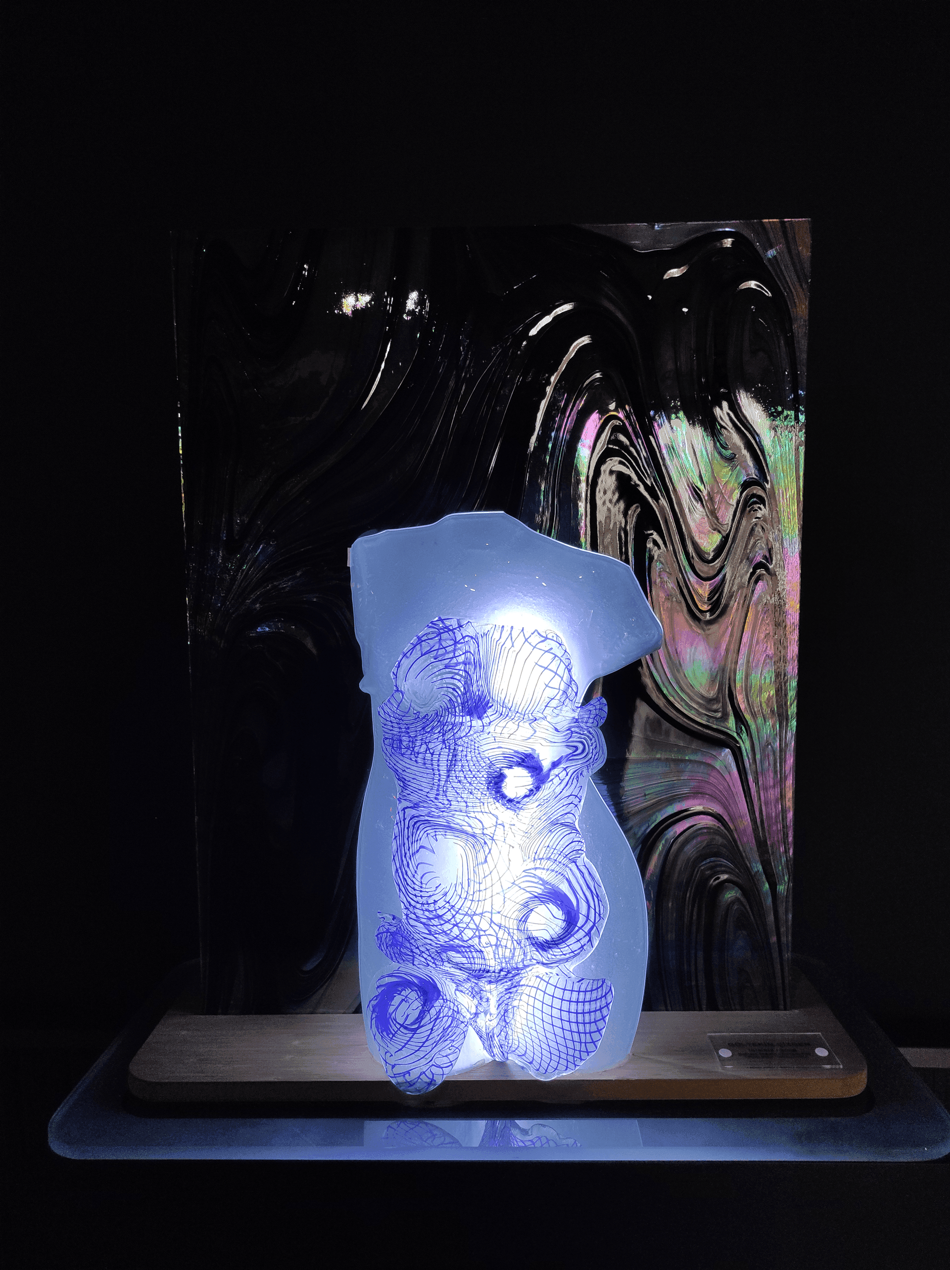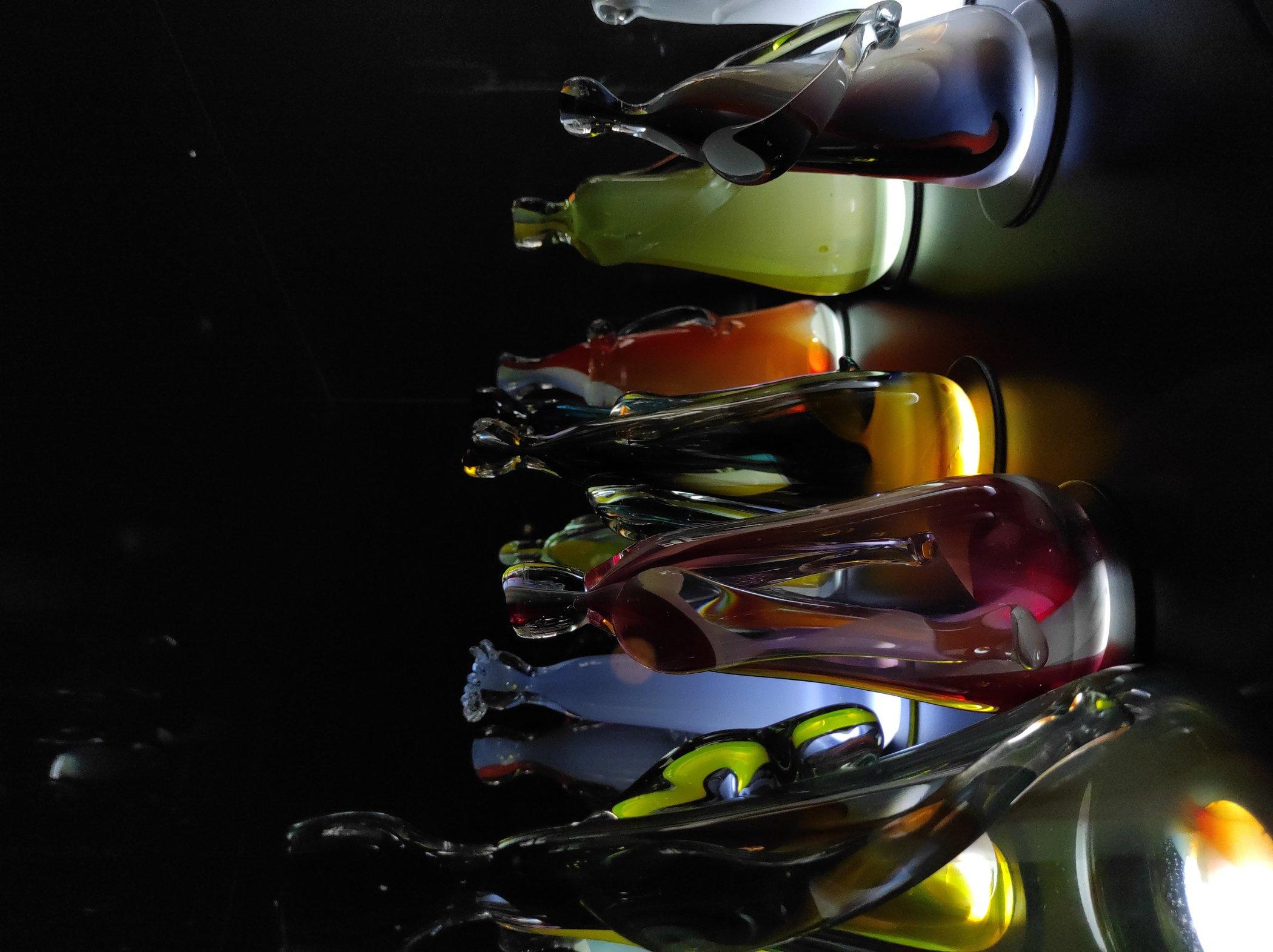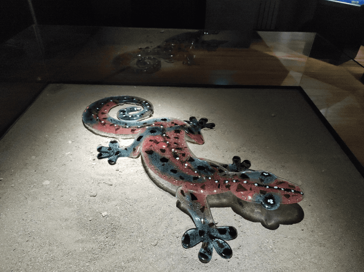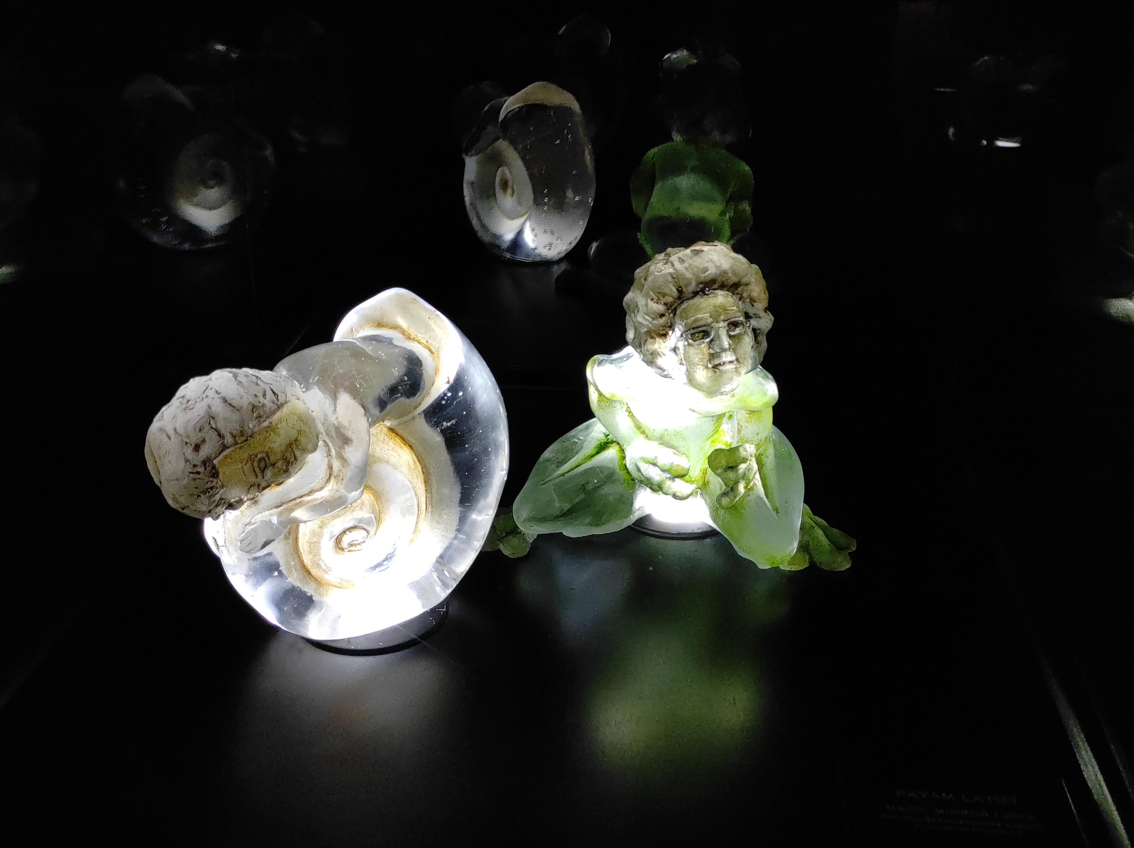 Bu salondan çıktığımızda hemen yanında gerçekten karanlık diyebileceğim bir odaya giriyoruz. Bu odada ise duvarlar siyah ve eserlerin bulunduğu cam fanusların büstleri de siyah renginde. Işıklandırma sadece eserlere yapılmış ve ışıklar eserlerin tam altına yerleştirildiği için camdan yapılan şaheserler parıl parıl parlıyor. Bu görüntünün sizi büyüleyeceğini ve sizi başka bir alemde gibi hissettireceğini söyleyebilirim. Bu odada daha karanlık olduğu için direkt sanat eserlerine dikkat çekilmiş. Işığın camla buluşmasından çıkan görsellik, göz zevkinize cidden hitap ediyor. Ben en çok bu odayı gezerken keyif aldım. En güzel ve en değişik eserler bence burada yer alıyor. Diğer salondaki eserler daha saf ve mavi yeşil tonlarındayken buradaki eserlerin daha renkli olduğunu söyleyebilirim. Bu salonda da eserler dört duvarı kaplıyor ve ortada yine sadece bir tane eser var ve aşırı büyük, camdan yapılmış bir Semender görüyoruz.