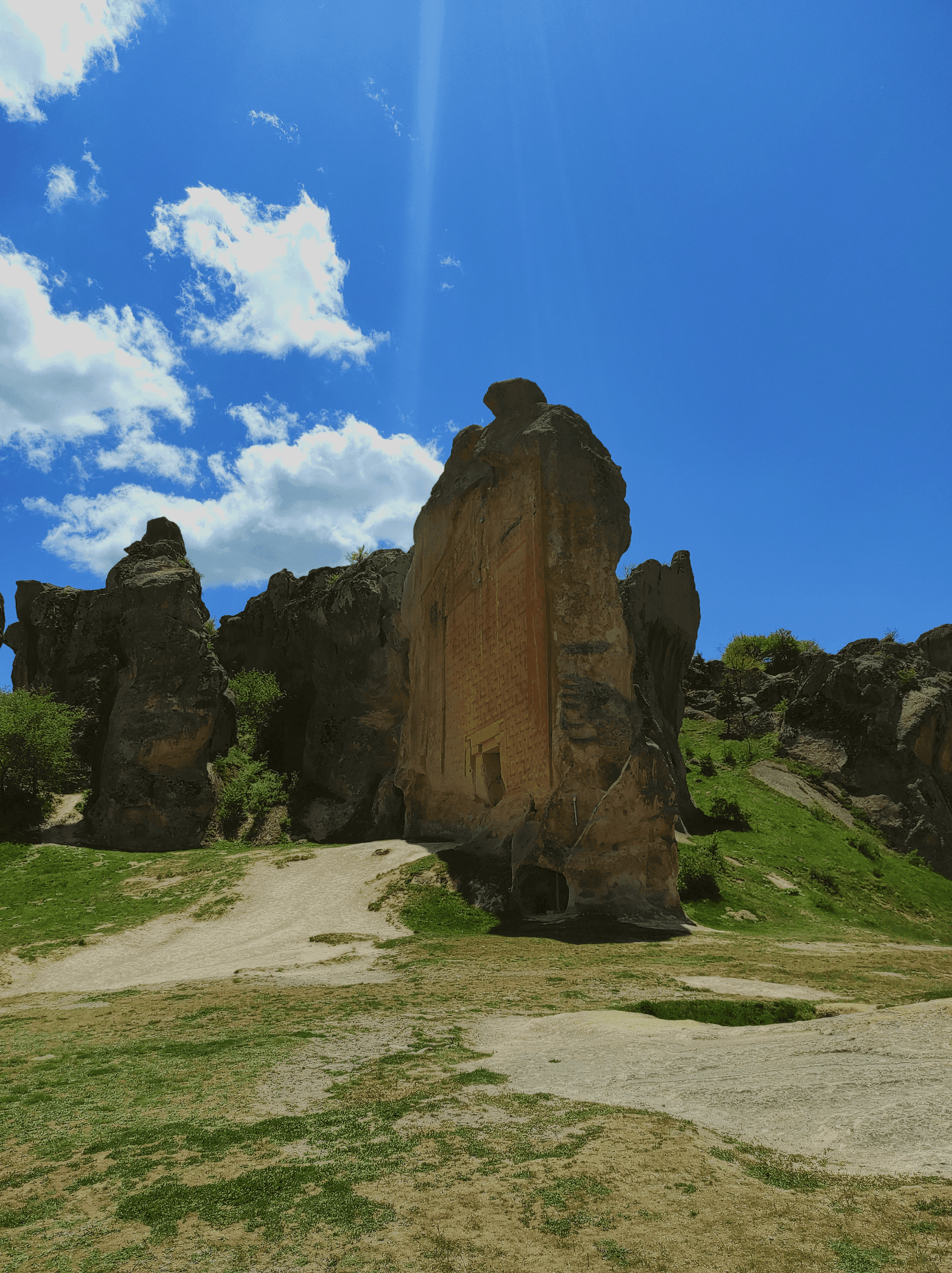 Aslanlı Mabet ’ten sonraki rotamız Yazılıkaya oldu. Burası Yazılıkaya köyünde yer alıyor ve köyden hemen kafanızı kaldırınca Yazılıkaya’yı görebiliyorsunuz. Otoparkına aracımızı park ettikten sonra kumanyalarımızı güzel ve gölge olan bir yerde yemek için yola koyulduk. Otoparkın ilerisinde yürüme mesafesinde ve Yazılıkaya’nın girişinde bulunan bir yapı var oradaki masalara oturup yemeğimizi yedik. Cana yakın ve karnı aç olan çok tatlı köpekler orada sizi bekliyor fakat zararsızlar. Sadece yemek yemek ve sevilmek istiyorlar. Yine de köpeklerden korkuyorsanız daha dikkatli olun derim. Burada yemeğimizi yedikten sonra hemen Yazılıkaya’nın bulunduğu bölgeye doğru yürüyoruz. Birçok Frig kalıntısının bulunduğu alana geliyoruz. Meşhur Midas Anıtı yani Yazılıkaya burada yer alıyor. Ayrıca şehrin içinde çok etkileyici sarnıçlar, Kırkgöz Kayalıkları ve Küçük Yazılıkaya bu bölgede bulunuyor. Anıtın üstünde, Paleo-Frigce yazılar yazmaktadır ve sol üstte yer alan yazıda “MIDAİ” kelimesi geçtiği için “Midas Anıtı” olarak bilindiği öne sürülüyor. Bu anıtın M.Ö. 8 ile 6’ncı yüzyıllar arasında yapıldığı düşünülmektedir. Diğer anıtlar gibi Yazılıkaya’da Ana Tanrıça Matar Kubileya’ya adanmış bir açık hava tapınağıdır. Frigler bahar aylarında, yeni yılı karşılama törenleri buradaki tapınakta gerçekleştiriyorlardı. Anıtın cephesi ise “doğuya” bakmaktadır. Çünkü Frig halkı ana tanrıça ile Güneşi de kutsal sayıyorlardı. Bu yüzden şehirde yapılan bütün anıt ve sunaklar, doğu yönüne bakmaktadır. Sadece “Bitmemiş anıt” batıya dönük olarak yapılmaya başlanmış, ancak bitirilememiştir.