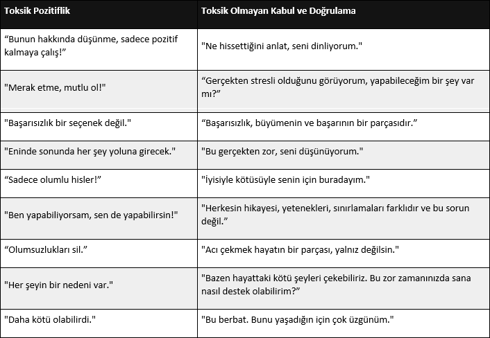 Toksik pozitiflik çok çeşitli biçimlerde karşımızda çıkabilir. İşte bunlarla karşılaşmış olabileceğimiz bazı örnekler: