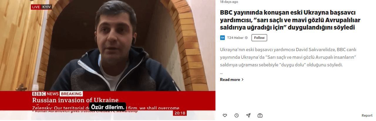Yine başka bir madde de ten rengi, göz rengi, saç rengi gibi fiziksel özelliklerin de haber yaparken ayrımcılık gibi sunulması. Buna örnek olarak: BBC ye konuşan Ukrayna Başsavcı Yardımcısı David Sakvarelidze "Benim için çok duygusal çünkü mavi gözlü ve sarı saçlı Avrupalıların öldürüldüğünü görüyorum" ifadelerini kullandı. Fiziksel özellikleriyle insanların bu kadar çok ayrıştırılması kabul edilemez bir ifadedir. Bu tamamen diğer farklı renkteki siyahi ve farklı göz rengindeki başka ülke vatandaşlarını aşağılamaktır. Elinde olmayan sebeplerle siyahi doğan vatandaşlara ikinci sınıf muamelesi yapmaktır.