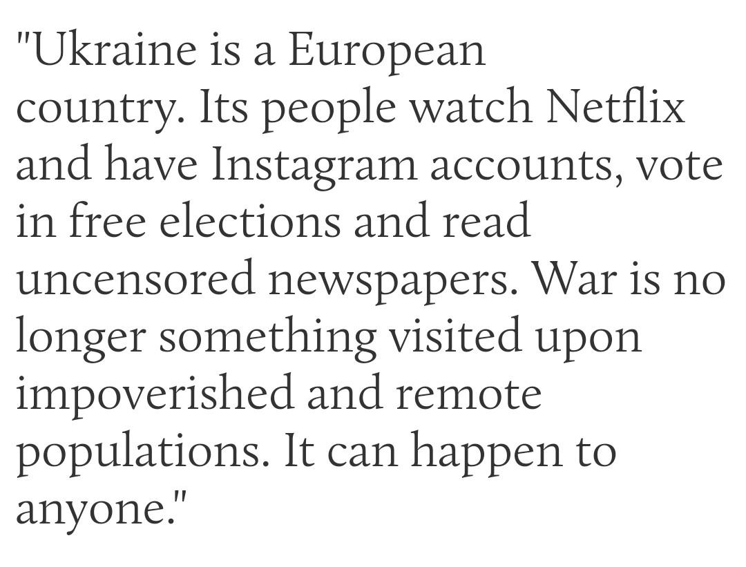 Başka bir örnek de verecek olursak eğer: The Daily Telegraph'ta Daniel Hannan'ın imzasıyla çıkan yazısında "Bize çok benziyorlar. Bu durumu çok şoke edici kılıyor. Ukrayna bir Avrupa ülkesi. İnsanlarının Netflix ve Instagram hesapları var, özgürce oy kullanıyor ve sansürsüz gazeteler okuyor. Savaş artık uzaktaki fakir insanların başına gelen bir şey değil" denildi. Bu açıklama da tamamen diğer ülkeleri küçümseyici amacıyla kullanılmıştır. İnsanlar karınlarını zor doyuruyorken elinde olmayan imkanlar yüzünden hiç kimse küçümsenmemeli ve eşit olmayan şartlarda karşılaştırılmamalıdır.