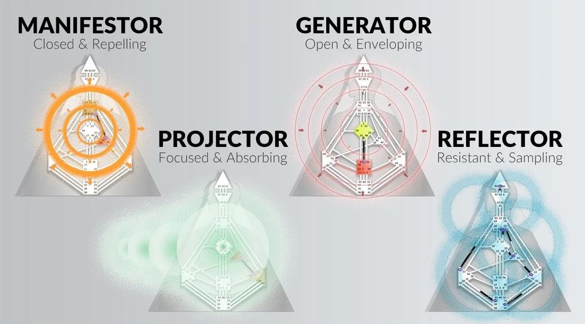 4) Reflektörler: Nüfusun %1’lik kısmında bulunan Reflektörler, diğerlerinin aksine etrafındaki kişilerin enerjilerini etrafa yansıtırlar. Auraları etrafa çok açıktır ki bu da aslında Reflektörlerin Human Design haritalarında 9 merkezin tanımsız/ renksiz/ açık olduğu anlamına gelir. Aynı zamanda bir Reflektör’ün sağlığı bulunduğu ortama göre değişebilir.