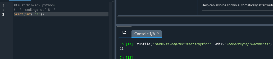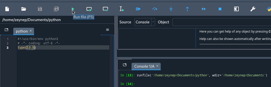 Spyder üzerinden kodlama yapıyorsanız, programınızı çalıştırmak için yukarıda yer alan ve imleç üzerinde geldiğinde Run File (F5) yazan oynatma tuşuna basabilirsiniz. Programın çalıştığını sağ tarafta, In [13] yazan yerde görebilirsiniz. Yine aynı şekilde F5 tuşuna basarak da programı çalıştırabilirsiniz. Bu şekilde de programın çalıştığını gözlemlemek mümkündür ancak sonucun ne olduğunu görmek istiyorsanız bundan biraz daha fazlasının yapılması gerekmektedir. Bu noktada print() fonksiyonu devreye girer.