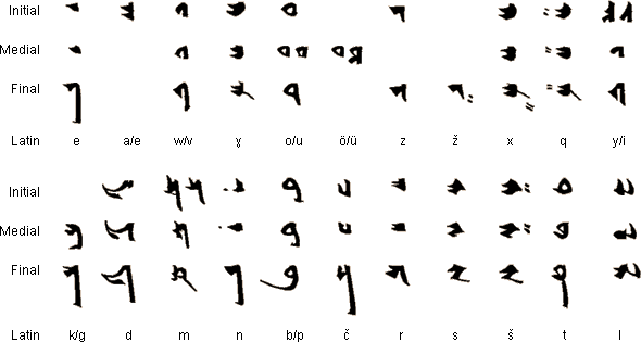 Uygur alfabesinin değişiklik yapılmadan önceki halidir çünkü Türkçedeki sesleri bu alfabe ile yazıya geçirmek zordur. Ticaret alanında kullanılmıştır.