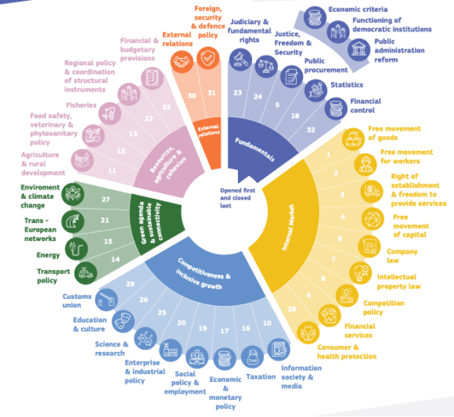 Each chapter is negotiated separately, and each chapter has a set of conditions for opening or closing. These discussions took held during Intergovernmental Conferences between member countries and the candidate country.