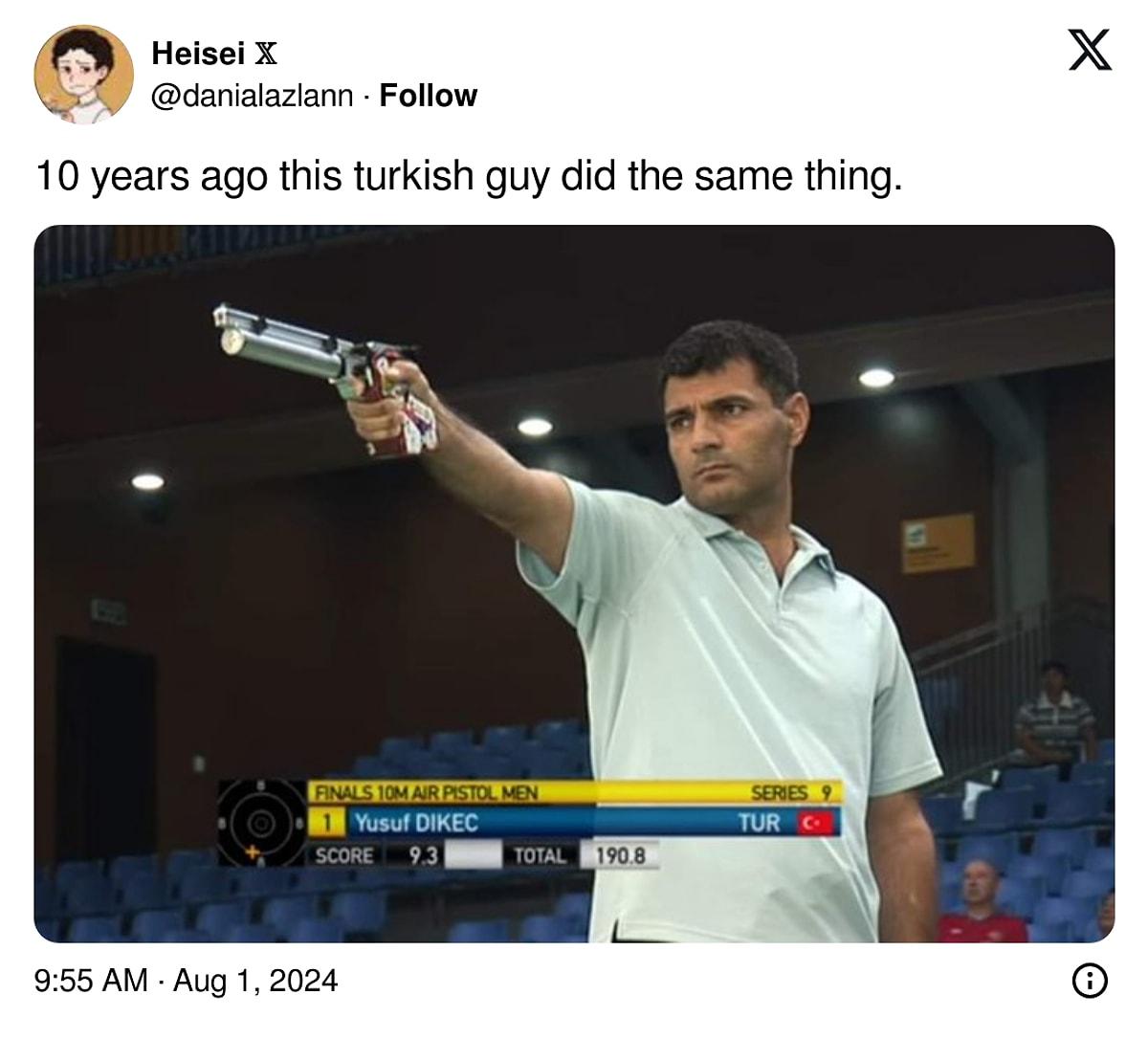 Yusuf Dikeç ne kadar bundan on yıl önce de aynı rahatlıkla Olimpiyatlara damga vurmuş da olsa bu yılki suikastçı rahatlığı ile bütün dünyayı kendine hayran bıraktı. Hollywood starlarından diğer atletlere kadar herkesi ikonik pozu ile etkiledi ve etkileşim yarattı. Son günlerde bütün dünya medyasında Türkiye'nin John Wick'i olarak geçiyor.