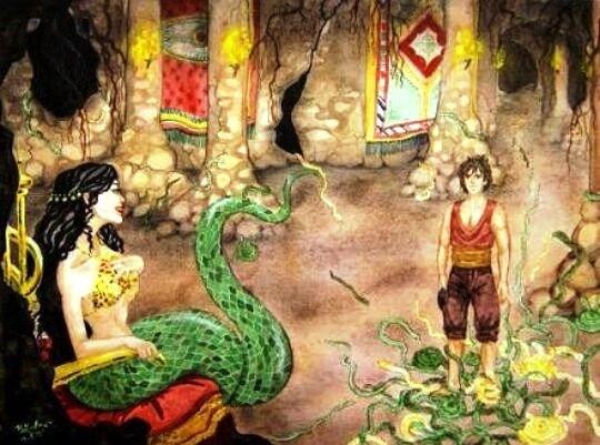 Güzeller güzeli Şahmaran yeraltına kendi kadar güzel bir bahçede yaşar. Genç bir adam olan Cansalp bazı rivayetlerde Lokman Hekim bir gün gezinti sırasında bir mağara keşfeder. Keşfettiği mağarada bir sürü bal vardır burada Şahmaran'ın yer altı bahçelerinden ışık süzmektedir.