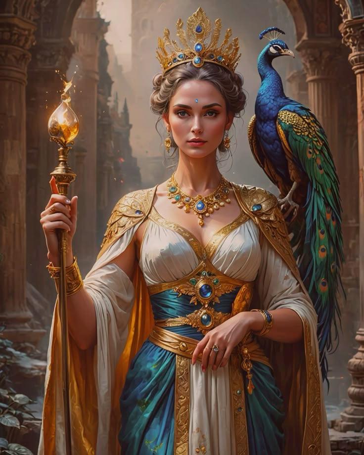 Hera evlilik kurumunun temsilcisi, doğum tanrıçasıdır. Simgesi erkek tavus kuşudur fakat bazı kaynaklara göre akrep de simgesidir. Roma adı Juno'dur ve Haziran ayını temsil eder, June-Haziran buradan gelir. Temsili meyveleri elma ve nardır, Atinalılar Hera'yı kutsal kabul ederler ve düğünlerinde gelinlere elma ve nar verirlermiş. Hera'nın kendi düğünü ise hem kardeşi hem de Olympos'un Tanrı kralı Zeus ile olmuştur. Fakat arkasında acı bir hikaye yatar.