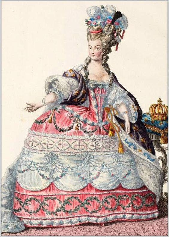 Madam Vigée Le Brun, 1787'de onu çocuklarıyla çevrili olarak resmettiğinde, kraliçe bir tür kürk - olası sansar ile kaplı kırmızı kadife bir elbise giymişti. Yaka, korse üzerinde hem beyaz gazlı bez hem de narin beyaz nakışı gösteriyor. Oturduğu pozisyondan görmek zor olsa da, korse ön bölge gibi kesilmiş gibi görünüyor.
