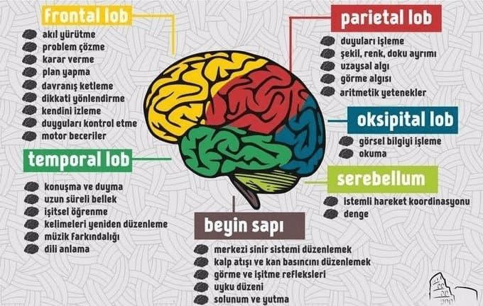 Frontal lob: Karar verme, planlama, problem çözme, konuşma ve istemli hareketlerin kontrolünü sağlar.