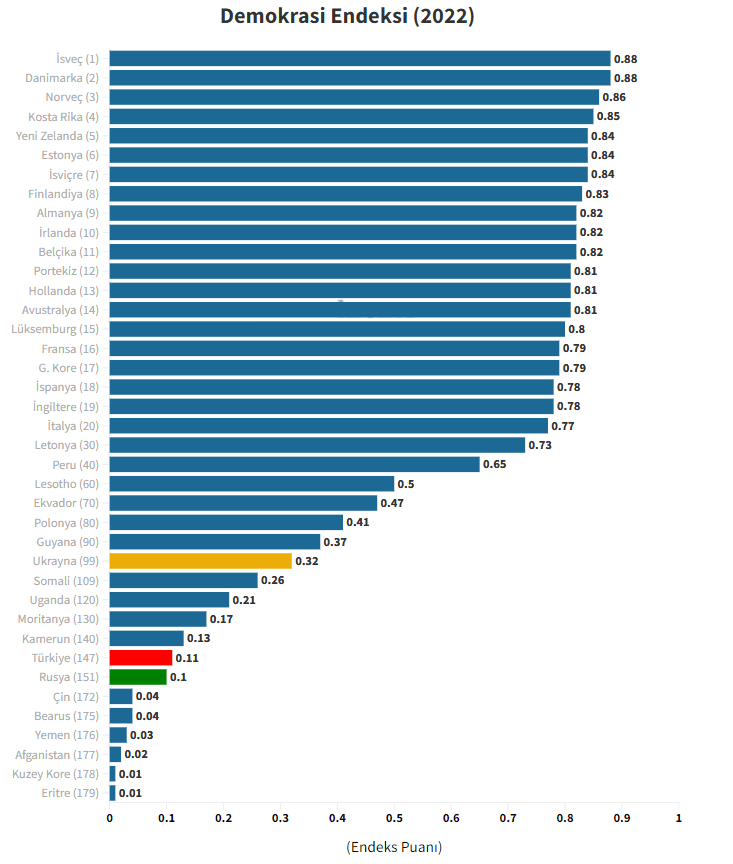 Demokrasi Endeksi'ne göre İsveç birinciyken, Doğu Afrika'da bir ülke olan Eritre, Kuzey Kore ve Afganistan son üçlüdür. Bu verilere göre Türkiye ise 179 ülke içinde 147.sıraya oturmuştur.