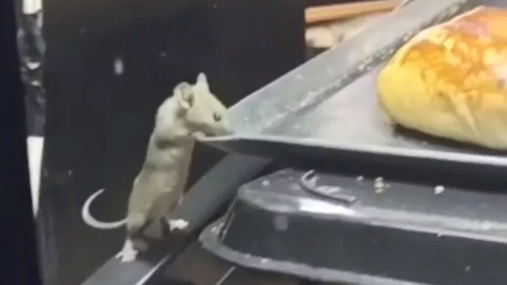 Görüntüde farenin, poğaça tepsisine kadar gelip gözden kaybolduğu görüldü.