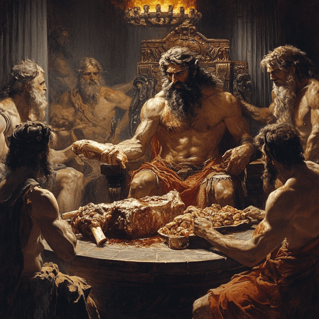 Kurnaz Prometheus bu etten insanlığın yararlanması için zekice bir plan yapmıştı. İkiye bölünmüş hayvanın bir kısmına yağlı ve lezzetli etleri toplamış ama üstünü yenmeyecek derilerle kaplamıştı. Diğer yarısına ise kemikleri toplamış ancak beyaz, pırıl pırıl parlayan iştah açıcı yağlarla üstünü kaplamıştı. Zeus’un seçtiği parça tanrıların payı olacaktı ve geri kalan ise insanlığa ait olacaktı. Prometheus, Zeus’tan bir tercih yapmasını istemişti: