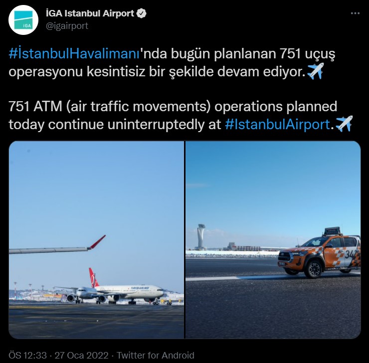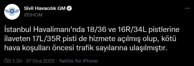 Konuyla ilgili olarak Sivil Havacılık Genel Müdürlüğü (SHGM) tarafından sosyal medya hesabından yapılan açıklamada, "İstanbul Havalimanı'nda 18/36 ve 16R/34L pistlerine ilaveten 17L/35R pisti de hizmete açılmış olup, kötü hava koşulları öncesi trafik sayılarına ulaşılmıştır" denildi.