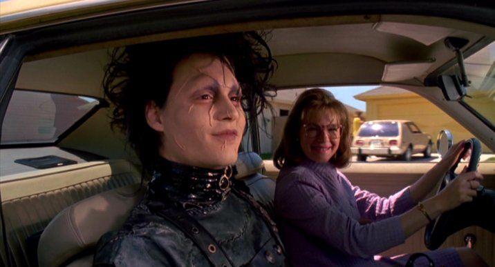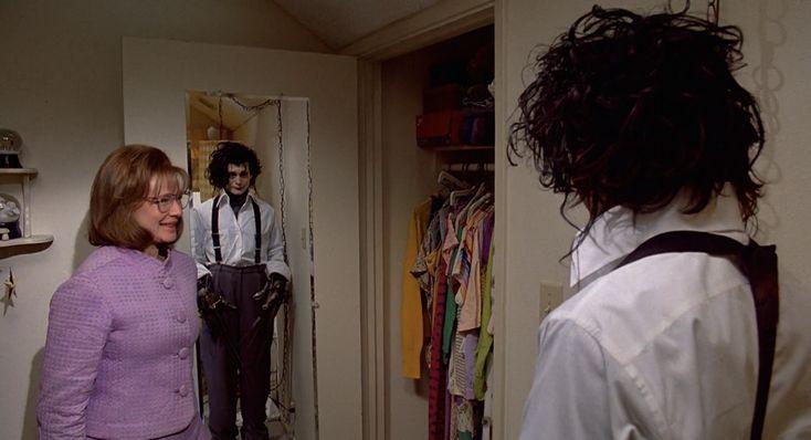 Edward topluma uyum sağlayabilmesi adına diğer insanlar gibi giyinilmeye zorlanırken onu beyaz gömlek ve askılı pantolon kıyafetlerinin içeresinde göreceksek de içindeki deri kıyafetlerinin görünmesi ile kendini yansıtmaya devam ederek karakterine dair ipuçları verir.