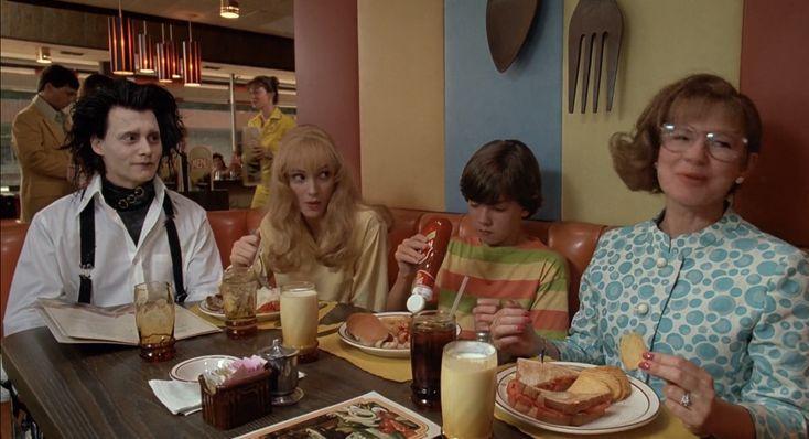 Edward’ın şatosunun zıttı niteliğinde kalan toplumun renkli hayatlarıyla beraber kendini gösterirken kullanılan mekan ve dekorların renklerinin canlı ve göz kamaştırıcı hayatları özendirici bir havası gereği filmde açık bir şekilde betimlenmesinin fark edilmesi kaçınılamaz göstergelerden yine en belirginlerinden biriyken aynı zamanda toplum insanlarının tavırlarının Edward’ın tavırlarına göre daha kötümser oluşu gözler önüne seriyor.