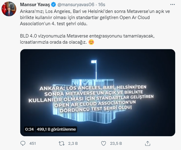 Gelişmeyi Yavaş duyurdu: "Ankara’mız; Los Angeles, Bari ve Helsinki’den sonra Metaverse’un açık ve birlikte kullanılır olması için standartlar geliştiren Open Ar Cloud Association’un 4’üncü test şehri oldu. BLD 4.0 vizyonumuzla Metaverse entegrasyonunu tamamlayacak, icraatlarımızla orada da olacağız."