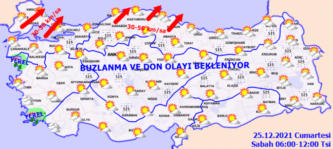 Meteoroloji Genel Müdürlüğü tarafından yapılan son değerlendirmelere göre ülkemizin kuzey ve batı kesimlerinin parçalı yer yer çok bulutlu, Kıyı Ege ve Çanakkale çevreleri ile Balıkesir'in batı kıyılarının yağmur ve sağanak yağışlı, diğer yerlerin parçalı ve az bulutlu geçeceği tahmin ediliyor. İç ve doğu kesimlerde buzlanma ve don ile birlikte yer yer pus ve sis bekleniyor.