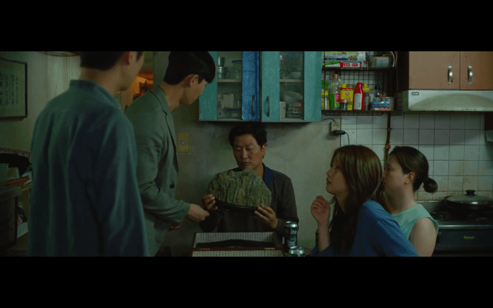 The stone reappears when the Kim family celebrates Ki-Woo's acceptance as a tutor for the Park family. When a drunkard urinates near their home, Ki-Woo takes the stone and walks toward the front entrance, further reinforcing its symbolism of courage and determination. On its last important appearance during the flood, Ki-Woo clings to the stone as the apartment fills with sewage water, pointing out his desperation and his need to cling on to the hope it signifies. This scene marks the collapse of their fortunes, pointing out how it is greed that led to their downfall.