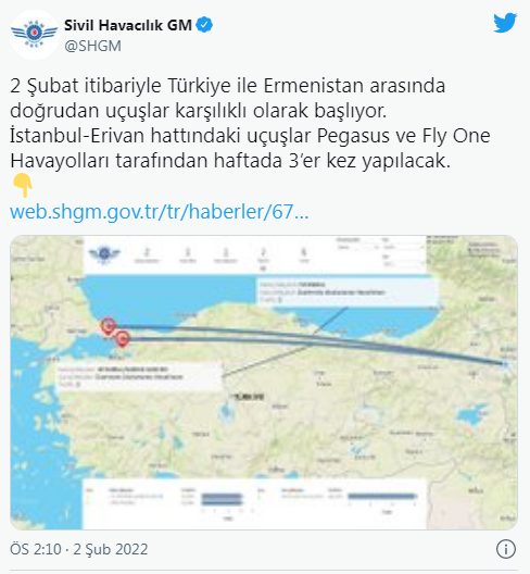 "2 Şubat itibariyle Türkiye ile Ermenistan arasında doğrudan uçuşlar karşılıklı olarak başlıyor. İstanbul-Erivan hattındaki uçuşlar Pegasus ve Fly One Havayolları tarafından haftada üçer kez yapılacak. 2 Şubat tarihinde yerel saatle 18:00'de Erivan Zvartnots Havalimanı'ndan kalkacak 3F475 sefer sayılı Fly One Havayolları uçağı saat 19:50'de İstanbul Havalimanı'na iniş yapacaktır. Aynı uçak 3F476 sefer sayısıyla 20:40'da İstanbul Havalimanı'ndan Erivan'a hareket edecektir. Pegasus Havayollarının PC550 sefer sayılı uçağı ise 23:35'te Sabiha Gökçen Havalimanı'ndan kalkış yapacak olup, Erivan'a gece yarısından sonra yerel saatle 02:35'de iniş yapacaktır. PC551 sayılı dönüş seferi 06:50'de Erivan'dan kalkacak olup, 07:55'de Sabiha Gökçen Havalimanı'na iniş yapacaktır."