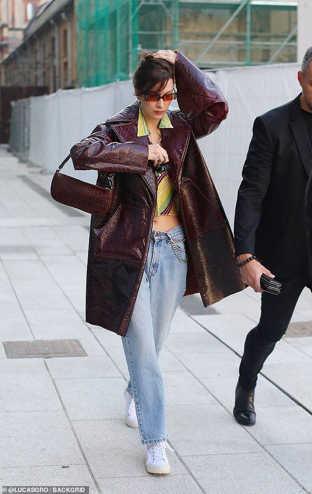 Bella, diz üzerinde biten deri ceketiyle aynı görünüme sahip bir baget çantayı tercih etmiş. Seksi, sert bir parça olan deri ceket ile birlikte açık renk bir jean giyerek kombinini daha spor bir hale getirmiş. Bahsettiğim jeane aksesuar takma olayını da yapmış.