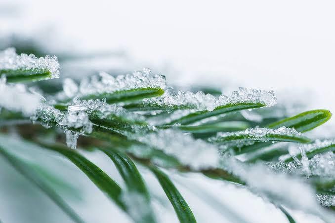 Kışın yaprak dökmeyen bir çam ağacının iğne yaprakları üzerindeki buz kristallerine rağmen soğuğa karşı direniyor.