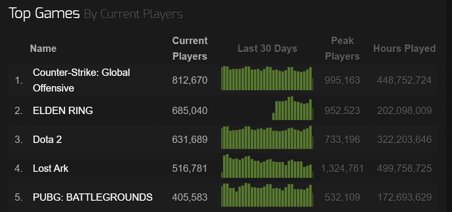 Oyun dünyasının güzelliği ve savaş sistemlerinin yaratıcılığıyla dikkat çeken oyun şu an dünyada 2. sırada yer alıyor. Oyun hakkındaki satış verilerini de SteamSpy isimli site açıkladı. Sitenin verilerine göre şu an Elden Ring sahibi olan Steam kullanıcılarının sayısı 20-50 milyon kişi arasında. Bu da oyunun, bu kadar kısa süre içerisinde, şimdiye kadar en çok satılan oyunlardan birisi olduğu anlamına geliyor.