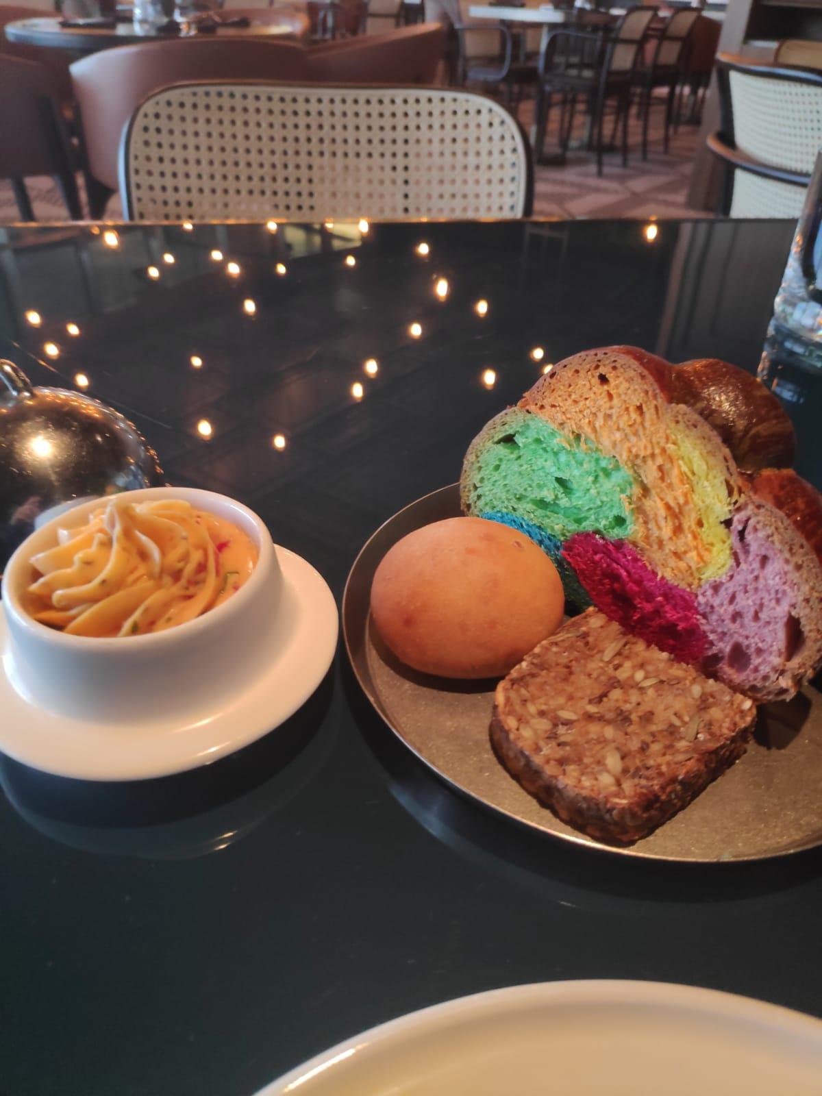 Restoran Para Gastrotke (Solda sebze çeşnili tereyağ, sağda doğal ürünlerle renklendirilmiş ekmek, unsuz tam buğdaylı Alman ekmeği, kuru domatesli roll ekmek)