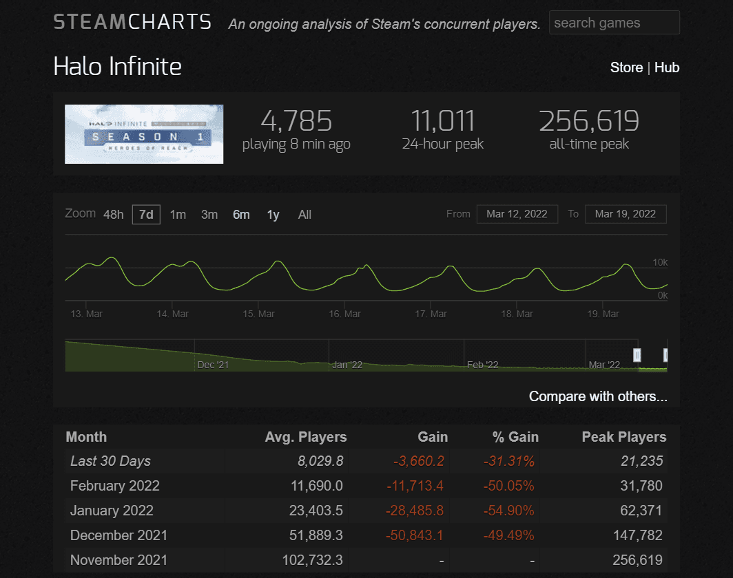 Steam Charts üzerinden görebileceğiniz üzere oyuncularını tutmayı başaramayan Halo Infinite her ay %50 kadar oyuncu kaybı yaşayarak total oyuncu sayısının %5-10 kadarıyla kaldı. Online kısmının dijital market satışlarıyla desteklendiği oyunun bu durumda nasıl ayakta kalacağını söylemek zor. Bununla beraber Sezon 2 ile gelmesi beklenen ve oyunda şu an mevcut olmayan tek kişilik hikaye modunun da durumu ne olacak bilemiyoruz.
