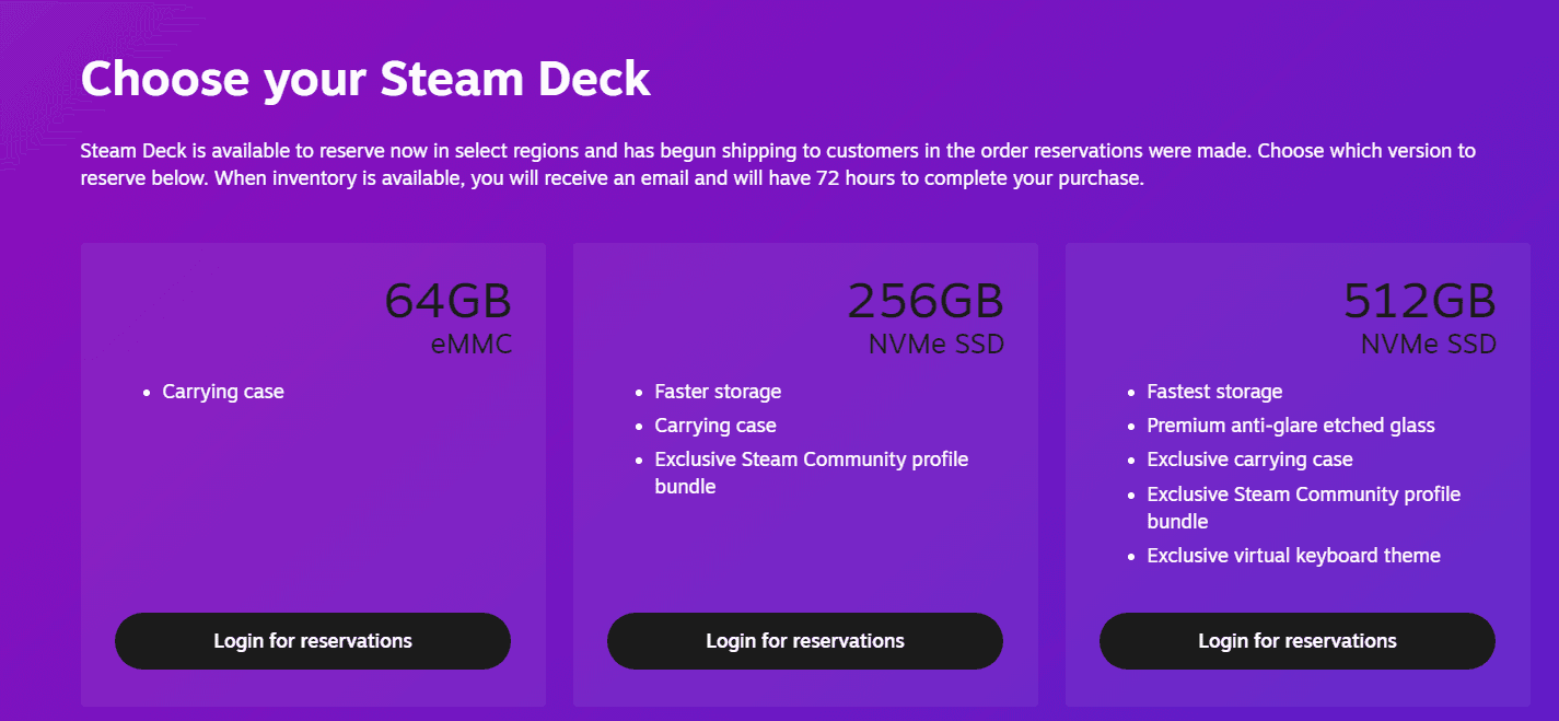 İçerisinde bulunan özel AMD işlemci çipi ve RDNA 2 grafik kartıyla piyasadaki çoğu rakibinin önünde bulunan Steam Deck, 400 dolarlık bir başlangıç fiyatından satılmakta. Üç varyantı olan ürün aşağıda görebileceğiniz üzere satılmakta.