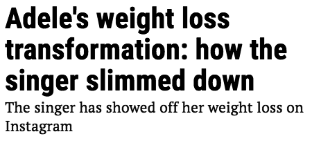 Moving on, the issue at hand is in the same vein as the issue of women's bodies perception. In the past couple of months, the legendary singersongwriter _Adele_has stepped back into the limelight; she appears to have lost a significant amount of weight, which was a personal decision she has made for herself. The media ran wild with the reveal, calling it "The Ultimate Glowup" and comparing recent images of her with old ones, casting her former, bigger body in a negative light. As toxic and damaging as this can be too many who were exposed to these headlines, and even to the renowned singer herself, its effect goes far beyond body image.