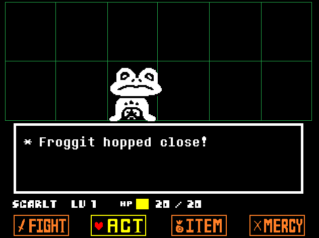 The game begins by telling the tale of what separated the world of monsters and humans. For a while, the two races rule over the earth together, but then a war breaks out. After the devastating war between humans and monsters ends, defeated monsters retreat and they are cast away to the underground. When the brief history lesson finishes, the players encounter the game screen where they need to pick their names to proceed with the game. In the game, the players control a child who happens to be fallen into the underground, the lands of monsters. Throughout the journey in the underground, the player encounters several monsters. The player can choose to fight with the monsters, or they can try to talk with the monsters to end the fight peacefully, or they can try to flee from the fight. When you encounter a monster, a screen will pop up and it will show you your health points, your ''level'', the ''fight'' button, the ''act'' button where you can choose to insult, flirt, and basically interact with the monster, the ''item'' button where you can eat something to earn health points or equip armor/weapon, and finally, the ''mercy'' button where you can try to spare the monster if its health is low or you managed to convinced monster not to fight, or you can try to flee. The leveling system in this game is quite different. Gaining experience in this game is not considered to be a good thing to do like the so-called level in this game ''LV'' stands for the level of violence. So it's not a way of measuring the player's experience but it is a way of measuring the player's capacity to hurt.