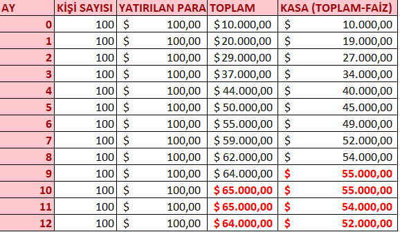 Onuncu ay 100 kişi sisteme dahil olacak 100'er dolar yatıracak. Kasada 65.000 dolar olacak. Faiz ödemeleri yapıldıktan sonra (65.000-10.000) kasada 55.000 dolar bulunacak. Bir önceki ay kasada kaç para vardı? Evet 55.000 dolar vardı.