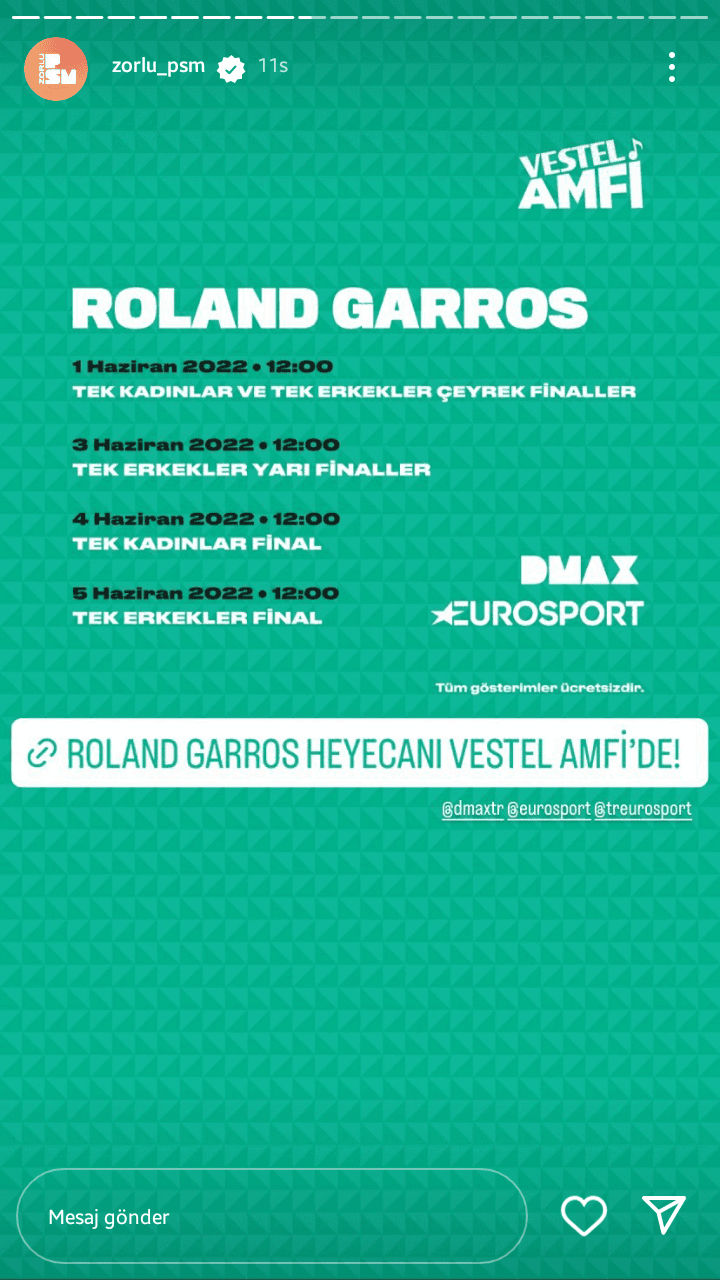 Fransa'nın Paris şehrinde düzenlenen, sezonun ikinci grand slam'ı olan ve şu zamana kadar bazen sürprizli, çoğu zaman heyecanlı maçlara sahne olan Roland Garros'un kalan maçlarını arkadaşlarınızla birlikte izleyebileceğiniz ücretsiz ve herkese açık alanda eşlik edebileceğiniz bir yer var; Zorlu PSM Vestel Amfi'si. Zorlu PSM instagram hikayelerinde ve resmi sitesinde açıklanan haber ve programa göre tek erkekler yarı finaller, tek kadınlar final ve tek erkekler final maçlarını Zorlu PSM'nin Vestel Amfi'sinde izleyebileceğiz. Alana giriş ücretsiz olacak olup, giriş yapabilmek için herhangi bir kayıt işleminin de gerekmediği sitedeki haberde ekstra olarak belirtilmiş. Hazır havalar da fazlasıyla ısınmışken tenis takip eden arkadaşlarımızla birlikte keyifli vakit geçirerek maçları izlemek şahane bir program olur bence :) Şimdiden herkese iyi seyirler diliyorum :))