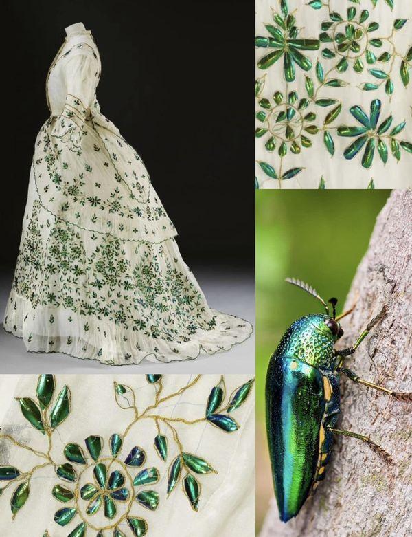 Victorians used beetle wings to decorate their dresses. Beetle wings were praised for their bright and vivid color, which they would once again link with femininity and attractiveness. While the results were visually gorgeous, the trend raises ethical questions.