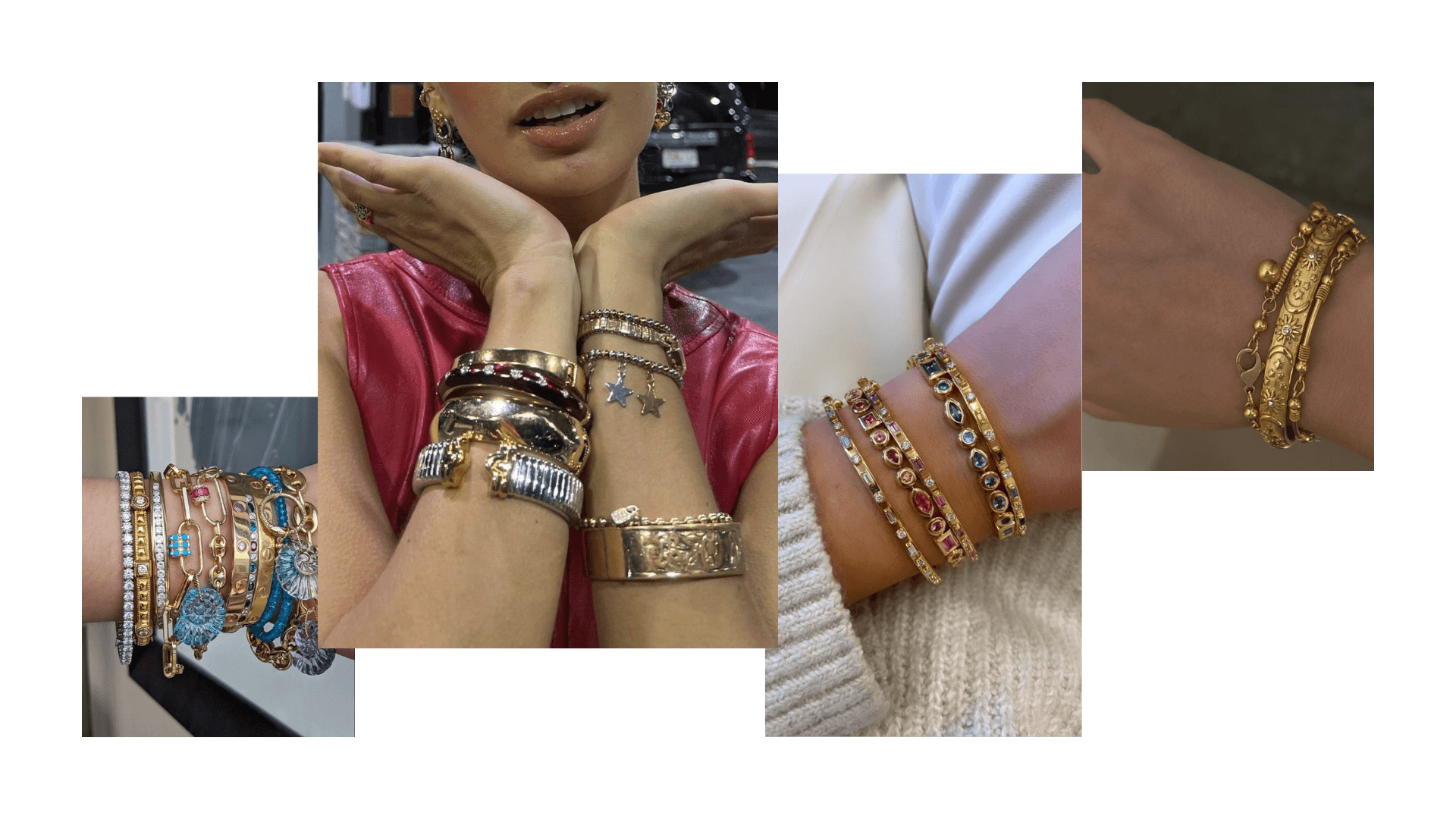 Kolyedeki kuralları baz alarak birbiriyle uyumlu ve dengeli setler hazırlayacağımız gibi hepsini karıp karıştırmak da bir seçenek. Kolyelere nazaran bileziklerde metalleri karıştırmak daha az zahmetli. Aralarına ekleyeceğiniz farklı renklerdeki ya da desenlerdeki bileklikler altın ve gümüş arasında bir ahenk sağlar. Aynı renk farklı dokular, farklı renk farklı dokular gibi uzayıp giden bir liste var elimizde.