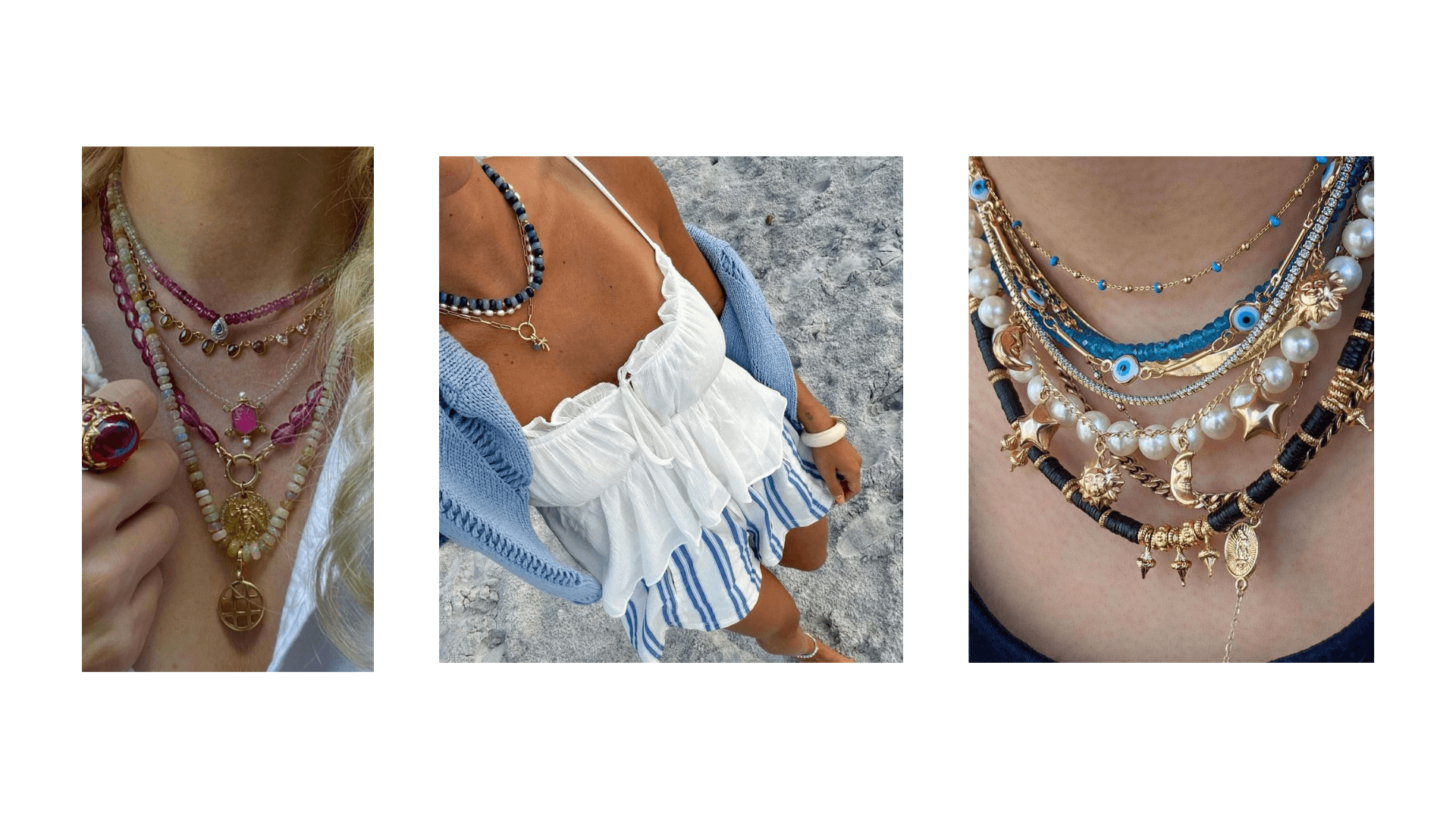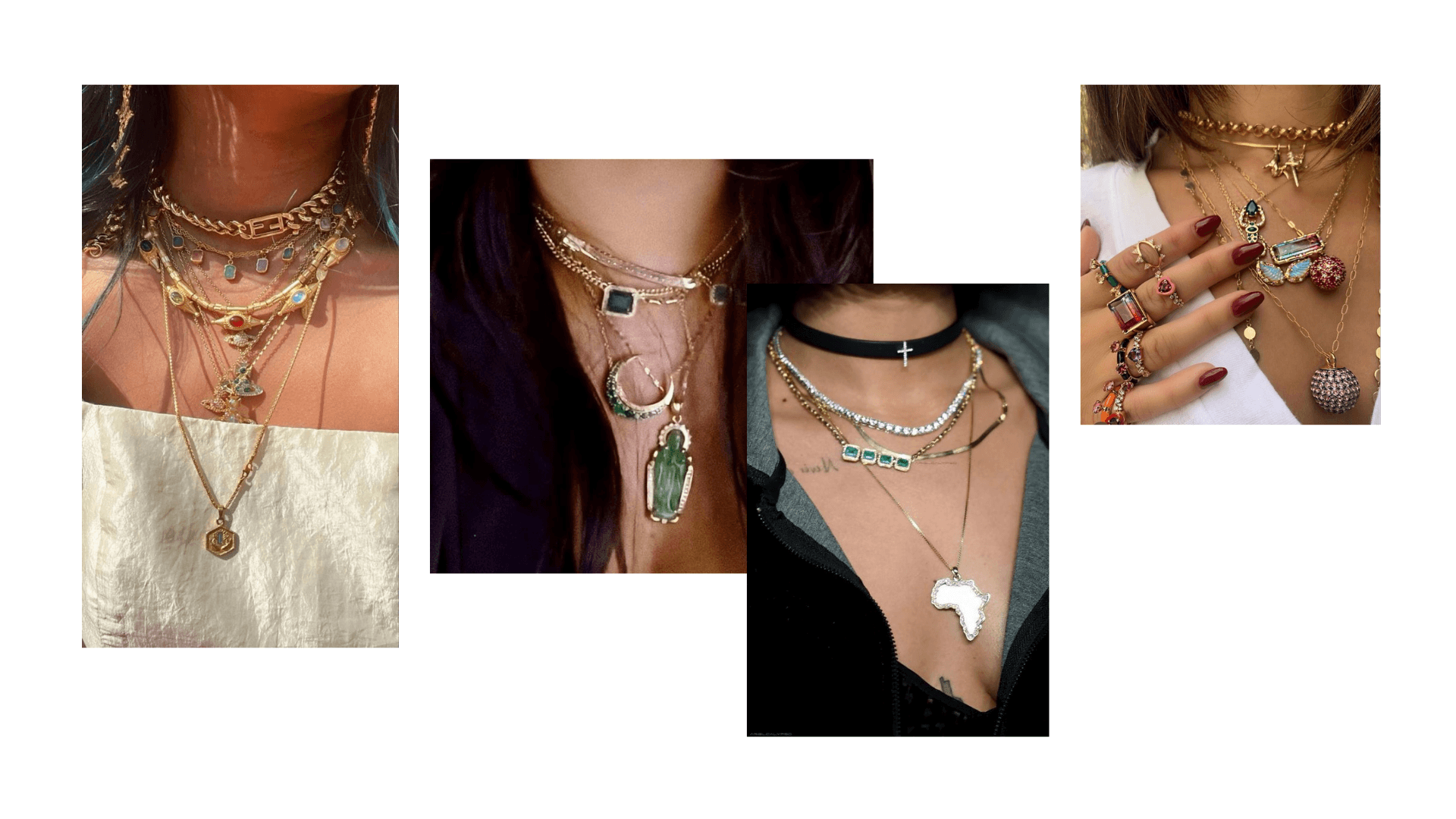 Takıları kombinlerken en küçük kolyeyi baz alıyoruz. Çünkü dikkat hep en üst kolyededir. Burada da zincirler ve tasmalar öne çıkıyor. Büyük ya da küçük zincirler; renkli, ışıltılı ya da sade ama ben buradayım diyen tasmalar…