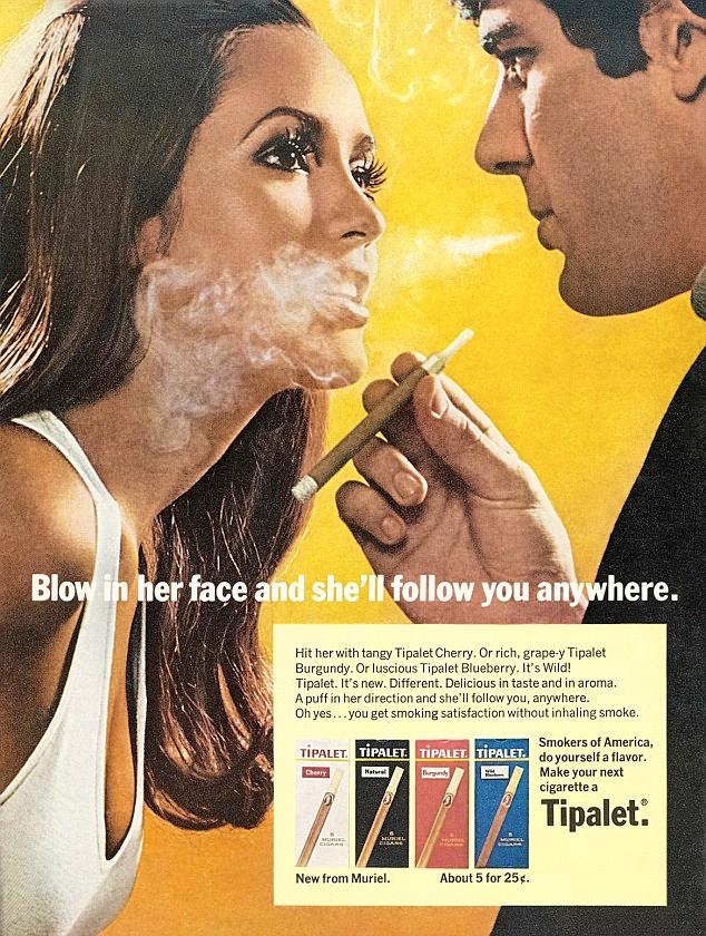 Published in 1969 by Muriel Cigar Company, Tipalet cigarette ad still sparks debate due to its portrayal of female passivity and power dynamics. The ad features a good looking man blowing smoke in the women's face and it basically suggests that the act of blowing smoke will attract the women, which put the woman in a position of submission. It conveys the idea that men can effortlessly manipulate women and their desires through a mere product like a cigarette. The woman is depicted not as an independent individual, but as someone who will follow, submissive. The ad is a great example of advertising that uses sexual allure to drive consumer and to sell products.