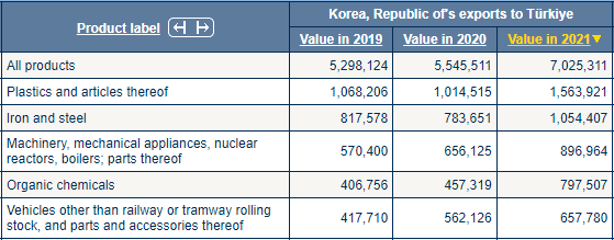 Güney Kore'den ithal edilen ilk beş sıraya baktığımızda;(1) plastikler ve bunlardan mamul eşya, (2) demir ve çelik, (3) makineler, mekanik cihazlar, nükleer reaktörler, kazanlar; bunların aksam ve parçaları, (4) organik kimyasallar, (5) demiryolu veya tramvay vagonları dışındaki araçlar ve bunların aksam ve parçalarını görüyoruz.
