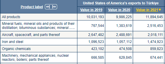 Amerika Birleşik Devletleri'nden ithal edilen ilk beş sıraya bakktığımızda; (1)Mineral yakıtlar, mineral yağlar ve bunların damıtılmasından elde edilen ürünler; bitümlü maddeler; mineral, (2)Uçak, uzay aracı ve bunların parçaları, (3)Demir ve çelik, (4)Organik kimyasallar, (5)Makineler, mekanik cihazlar, nükleer reaktörler, kazanlar; parçalarını görüyoruz.