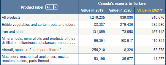 Kanada'dan ithal edilen ilk beş sıraya baktığımızda; (1)Yenilebilir sebzeler ve bazı kökler ve yumrular, (2)Demir ve çelik, (3)Mineral yakıtlar, mineral yağlar ve bunların damıtılmasından elde edilen ürünler; bitümlü maddeler; maden, (4)Uçak, uzay aracı ve bunların parçaları, (5)Makineler, mekanik cihazlar, nükleer reaktörler, kazanlar; parçalarını görüyoruz.