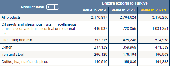 Brezilya'dan ithal edilen ilk beş sıraya baktığımızda; (1)Yağlı tohumlar ve yağlı meyveler; çeşitli tahıllar, tohumlar ve meyveler; endüstriyel veya tıbbi, (2)Cevherler, cüruf ve kül, (3)Pamuk, (4)Demir ve çelik, (5)Kahve, çay, maté ve baharatları görüyoruz.